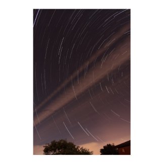 A series of long exposure shots of the night sky are combined to create a dramatic star streak, with a bit of the ground included for contrast.